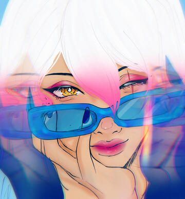| HAIR. | naturally dark hair, which naturally became white but has been dyed with a gradient of hot pink, purple, and navy blue [in that order]. |